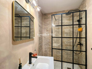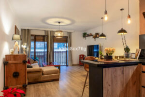 El interior presenta una estética cálida y contemporánea, con suelos de madera en toda la vivienda y abundante luz natural gracias a las ventanas equipadas con estores de bambú. La cocina destaca por sus armarios de madera, encimeras negras y electrodomésticos de acero inoxidable, incluyendo horno empotrado y frigorífico.