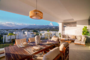 La amplia terraza privada ofrece espacio suficiente para dos zonas diferenciadas de estar o descanso, ideales para disfrutar del clima de Marbella, espectaculares puestas de sol y vistas abiertas. El apartamento goza de total privacidad, con la piscina situada convenientemente justo debajo.