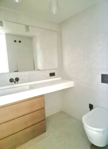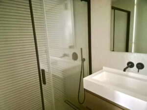 * Baños con sanitarios suspendidos, grifería empotrada en acabado negro y ducha integrada en el pavimento.