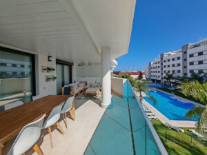 Apartamento en venta en , Mijas Costa con 3 dormitorios, 2 baños, 1 baño en suite, 1 aseo y con orientación sur, con piscina comunitaria y garaje privado (1 plazas). Respecto a las dimensiones, la propiedad presenta 96,79 m² construidos y 45 m² de terraza. Tiene las siguientes características transporte cercano, aire acondicionado, completamente amueblado, cocina totalmente equipada, almacén, gimnasio, entrada de seguridad, cristal doble, videoportero, a estrenar, servicio de seguridad 24h, aseo para invitados, cocina equipada, salón, riego automático, persianas de seguridad, internet – wi-fi, terraza cubierta, persianas eléctricas, armarios empotrados, comunidad cerrada, ascensor, vistas al jardín, vistas a la piscina, vistas a la calle, parque infantil cercano, cerca del golf, puertas de cristal, cocina americana, balcón, accesible para movilidad reducida, excelente estado, tiendas cerca, cerca de la ciudad, colegios cerca, cámaras de vigilancia y animales permitidos.