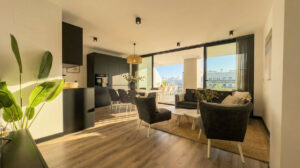 El apartamento incluye un baño moderno con ducha amplia, un salón-comedor con cocina abierta e isla y una terraza con vistas a la piscina. También dispone de una plaza de aparcamiento privada en el garaje subterráneo y un trastero separado, lo que proporciona comodidad adicional y espacio de almacenamiento práctico.