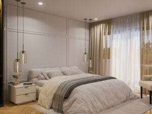 Todos los dormitorios están bañados por la luz del sol, creando un ambiente cálido y acogedor. La suite principal ofrece un refugio tranquilo, con baño privado y armarios empotrados. Los otros dos dormitorios son amplios y versátiles, ideales para invitados, familia o una elegante oficina en casa.