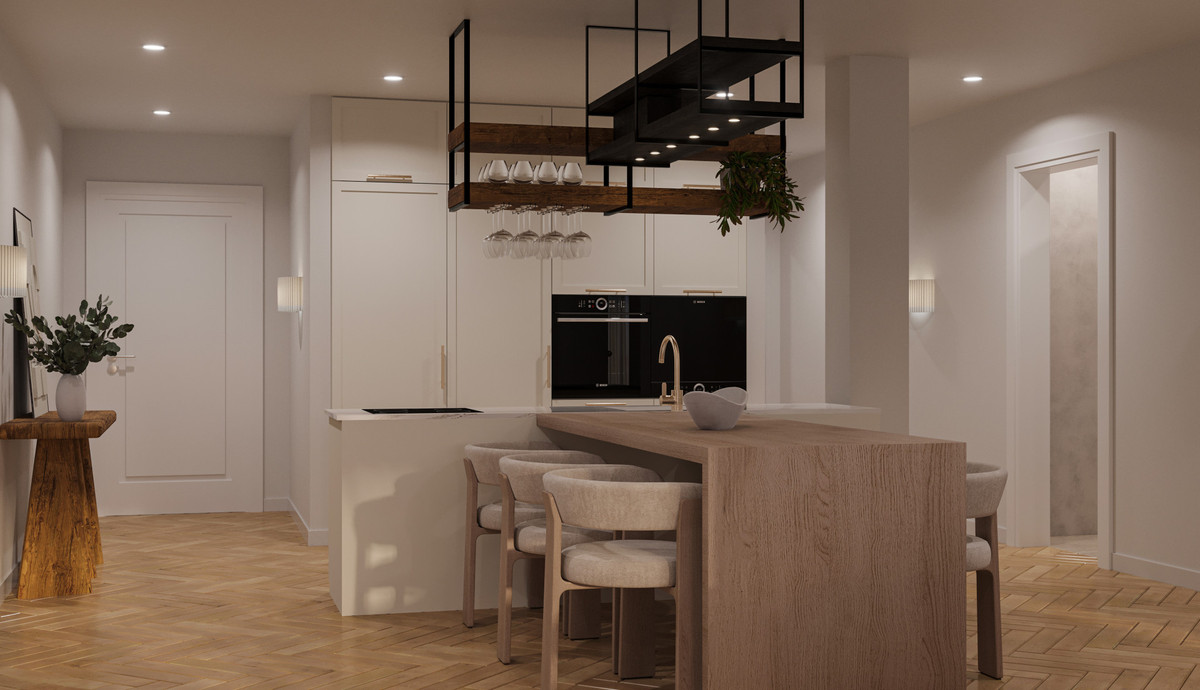 Los interiores han sido cuidadosamente rediseñados para combinar la elegancia contemporánea con el confort cotidiano. La cocina abierta, acabada con materiales de primera calidad y elegantes electrodomésticos, fluye a la perfección hacia un luminoso salón y hacia una generosa terraza orientada al sur, perfecta para tomar el café por la mañana, cenar al aire libre o simplemente disfrutar de las vistas de la costa.