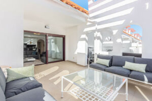 Salga a la amplia terraza orientada al este/sur, equipada con una encantadora pérgola, ideal para relajarse, comer o recibir invitados mientras disfruta de las hermosas vistas a la montaña de La Concha.
