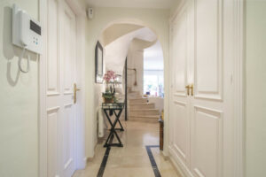 Al entrar, nos encontramos con un acogedor vestíbulo flanqueado por dos dormitorios y un baño. El más pequeño de estos dos dormitorios, ideal para invitados o niños, cuenta con un bonito baño en suite.