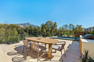 El exterior está diseñado para disfrutar todo el año e incluye piscina privada, cocina exterior con BBQ, zona lounge y comedor con vistas espectaculares.