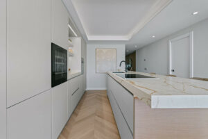 La cocina abierta con electrodomésticos Siemens se integra perfectamente con el salón y el comedor, creando un espacio ideal para vivir y recibir invitados.