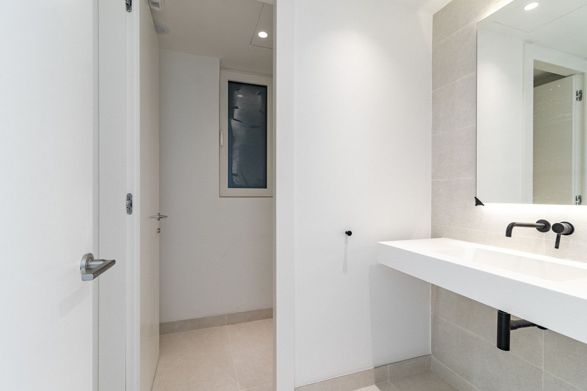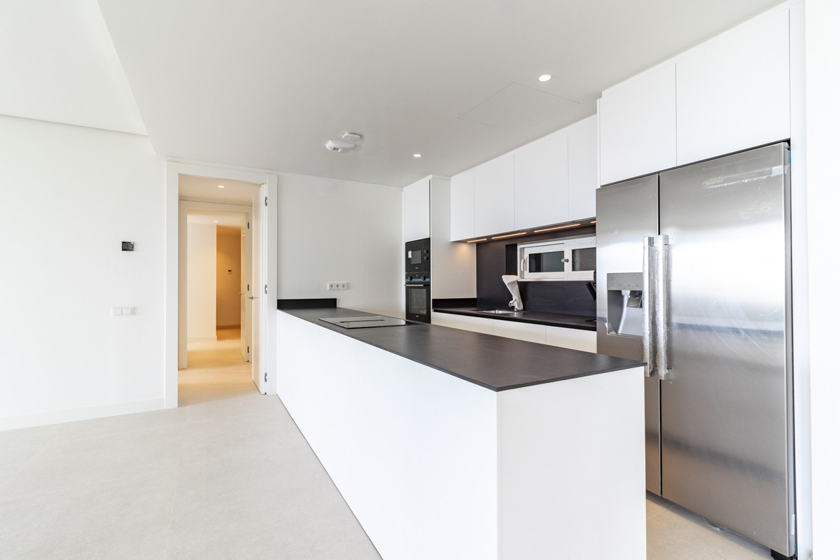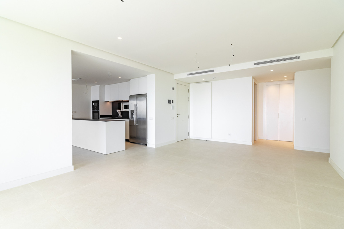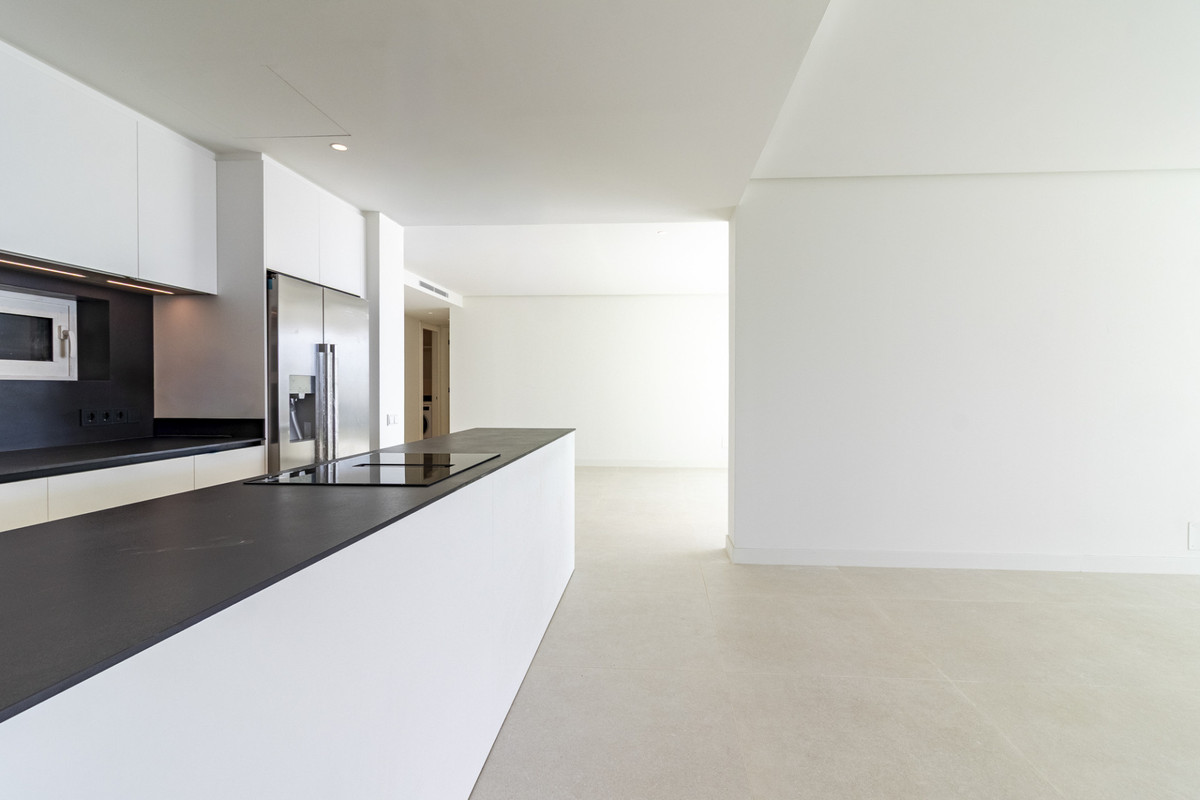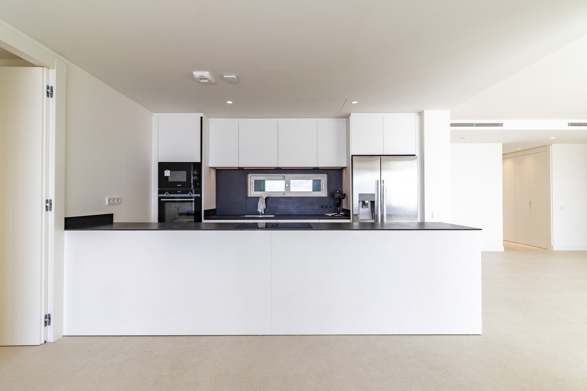 El espacioso salón-comedor de planta abierta se integra perfectamente con la cocina moderna y totalmente equipada, creando un ambiente luminoso y funcional que conecta directamente con la terraza. El diseño combina de forma armoniosa los espacios interiores y exteriores, ofreciendo una auténtica experiencia mediterránea.