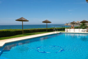 Justo al otro lado de las puertas francesas del salón, le espera un amplio patio abierto donde podrá relajarse con una copa de vino mientras toma el sol y admira las impresionantes vistas al mar y a la playa. Tenga en cuenta que se encuentra en una zona común, pero nadie más la usa. El hermoso jardín que rodea la piscina crea un remanso de paz, con tumbonas para una relajación total.