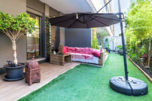 En la terraza, toldo eléctrico y césped artificial, creando un espacio cómodo y funcional.