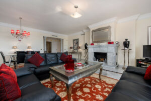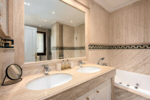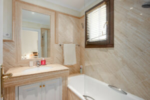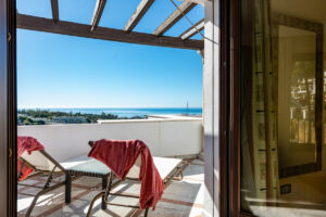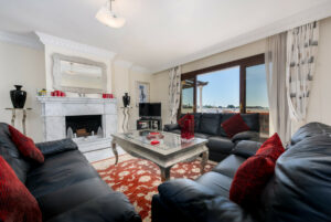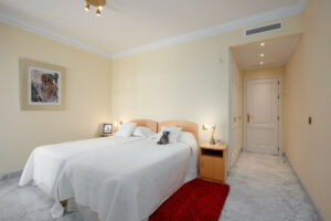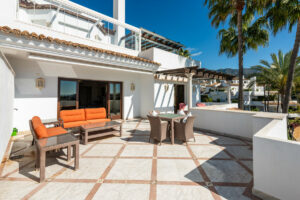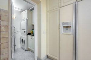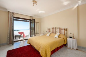 La propiedad está decorada de forma clásica y consta de un amplio salón con chimenea, así como tres dormitorios dobles, cada uno con su propio cuarto de baño; incluyendo la suite de los propietarios que ofrece vistas al mar y acceso directo a la terraza, así como un cuarto de baño de gran tamaño con bañera de hidromasaje, lavabos dobles y una cabina de ducha, así como un vestidor. Hay una cocina totalmente equipada con electrodomésticos Siemens, una nevera americana doble, y un lavadero independiente con su propia terraza pequeña.