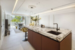 El apartamento luce materiales y acabados de primera calidad, destacando azulejos de gran formato de marcas reconocidas como Porcelanosa y Ascale en las zonas de estar. Los ventanales de aluminio Cortizo de suelo a techo inundan el espacio de luz natural y proporcionan acceso directo a la terraza. El diseño de planta abierta conecta a la perfección las áreas de sala y cocina, mejorando la sensación de espacio y fluidez. La cocina hecha a medida, totalmente equipada con electrodomésticos Siemens nuevos, cuenta con una elegante isla de mármol, que añade estilo y funcionalidad.