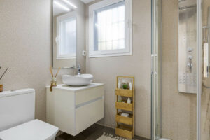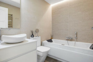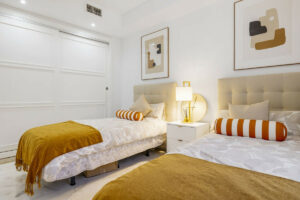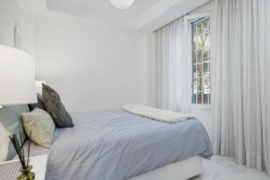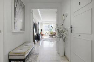 En el interior, el apartamento es impecable y funcional. Los tres dormitorios son amplios y cuentan con armarios empotrados de suelo a techo, mientras que los dos baños —incluido el de la suite principal con bañera completa— están acabados con un estándar moderno y nítido. Una cocina independiente mantiene la zona de servicio del hogar apartada del área de estar principal.