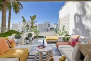 La característica más destacada es, sin duda, su terraza de 60 m². En una región donde la vida transcurre al aire libre la mayor parte del año, este espacio se convierte en la zona de estancia principal. Es lo suficientemente amplia para un juego de sofás completo, una mesa de comedor para diez personas y tumbonas, lo que la hace tan adecuada para un café tranquilo al sol por la mañana como para una cena nocturna con amigos.