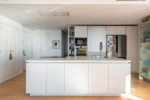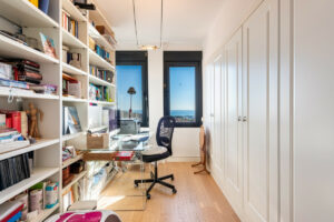 El apartamento se distribuye en dos dormitorios, cada uno con dos dormitorios, y una enorme cocina-salón de planta abierta con impresionantes vistas entre ambos.