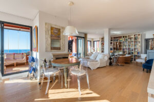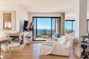 Todo el salón y el dormitorio principal están cubiertos con puertas correderas de cristal y rodeados de terrazas.