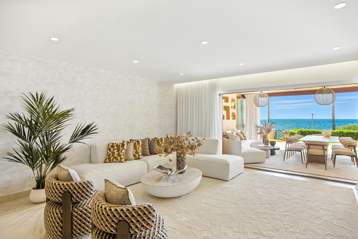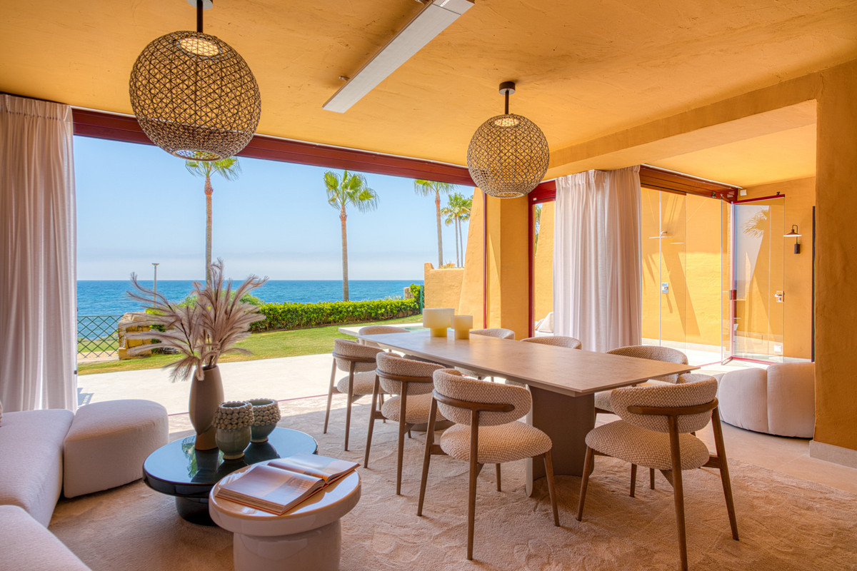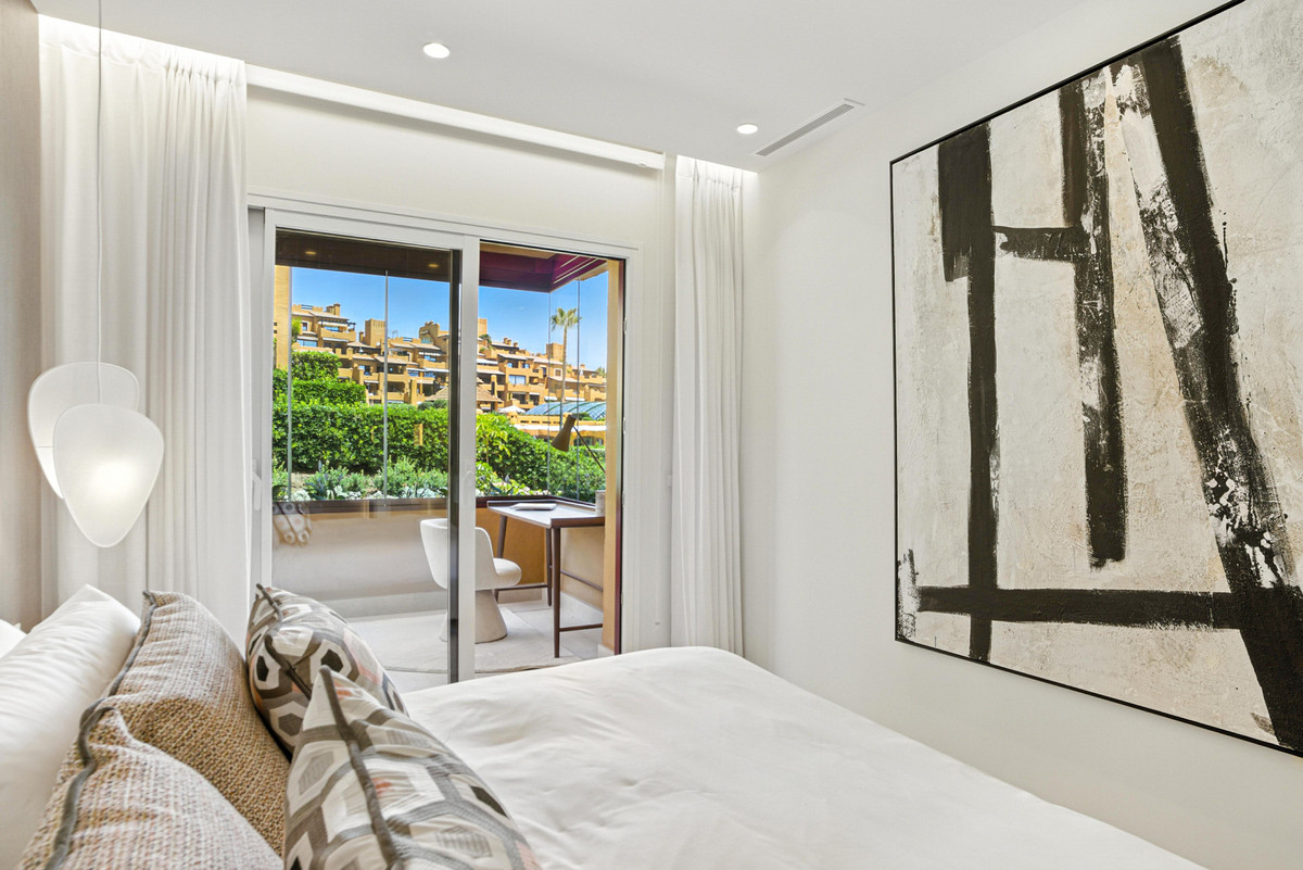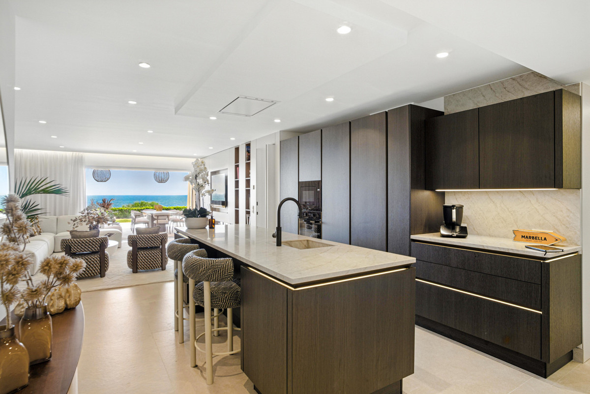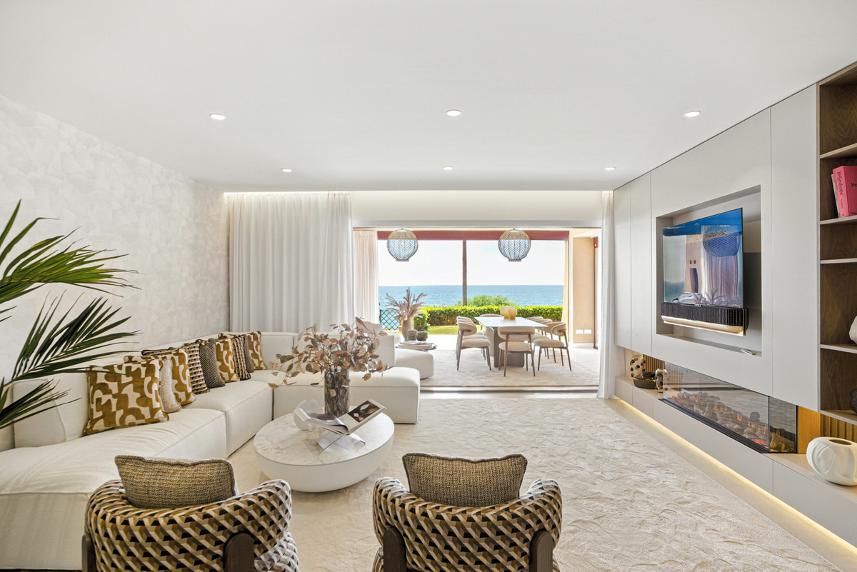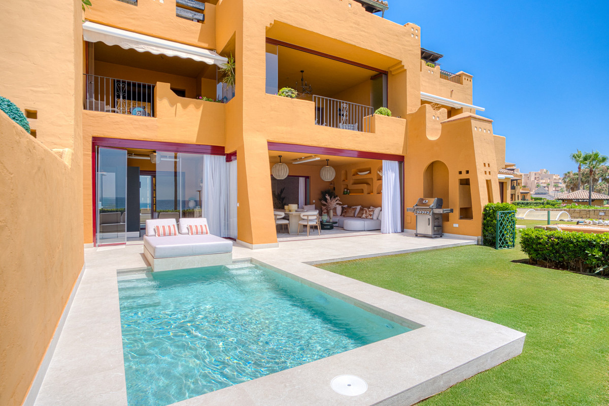 Impresionante apartamento orientado al sur con cuatro lujosos dormitorios y cuatro amplios baños, mezclando perfectamente la elegancia moderna con el confort de alta gama. Situado en la exclusiva urbanización Los Granados del Mar en la Nueva Milla de Oro, la residencia ofrece acceso directo a la playa y vistas panorámicas del Mar Mediterráneo. Completamente renovado con acabados premium, cuenta con una amplia terraza de 87 m2 con piscina privada y un exuberante jardín, perfecto para la relajación al aire libre. En su interior, encontrará una cocina abierta equipada con electrodomésticos alemanes de alto nivel, una placa invisible y una segunda cocina con nevera de vino, ideal para entretener. Entre los aspectos más destacados se incluyen suelos elegantes contemporáneos, calefacción por suelo radiante, una chimenea eléctrica, una bañera independiente, una sauna privada, una oficina dedicada, armarios personalizados y un sistema de sonido de última generación. Los residentes de esta exclusiva comunidad cerrada disfrutan de comodidades de clase mundial, incluyendo un restaurante in situ, piscina cubierta climatizada, dos piscinas al aire libre, gimnasio, sauna, jacuzzi, seguridad 24 horas, y cerca de restaurantes de alta gama, tiendas, escuelas internacionales, el nuevo complejo Laguna, y el corazón de Estepona.
