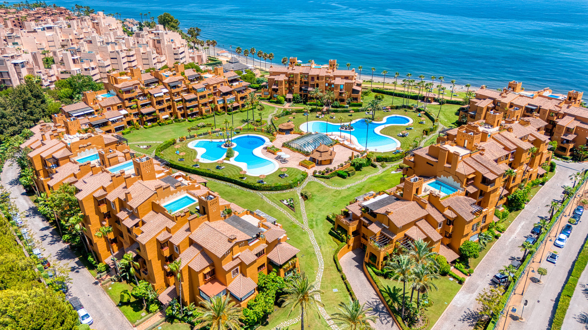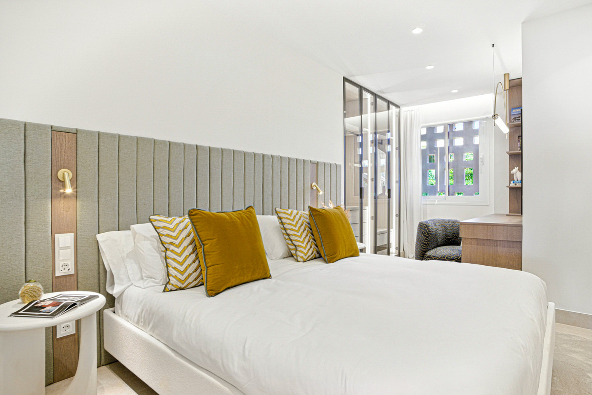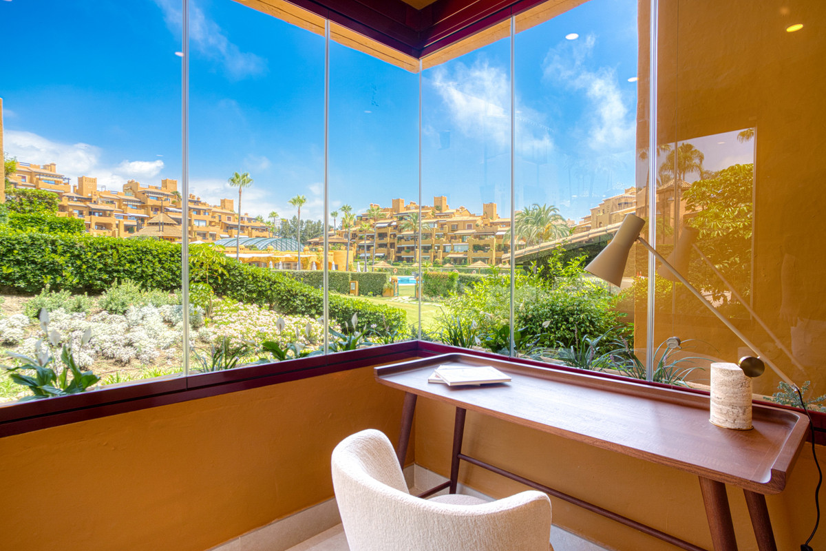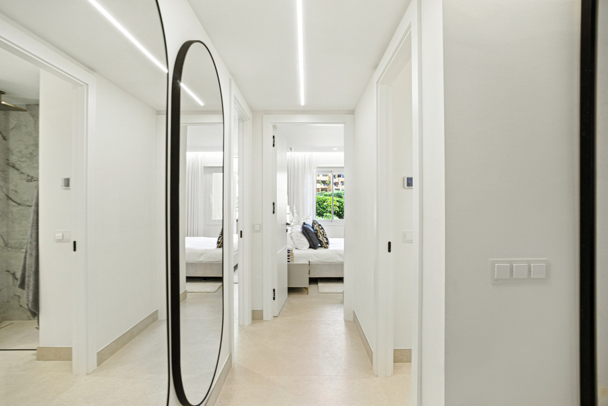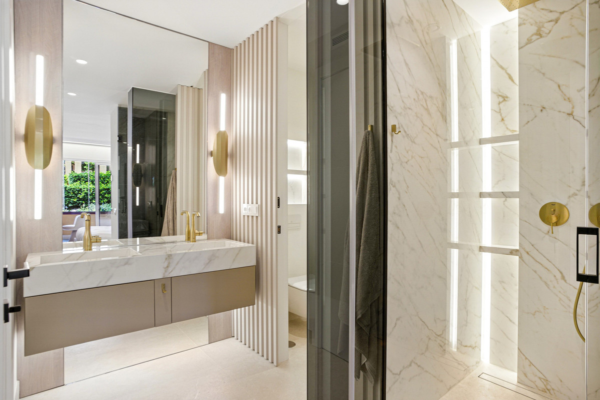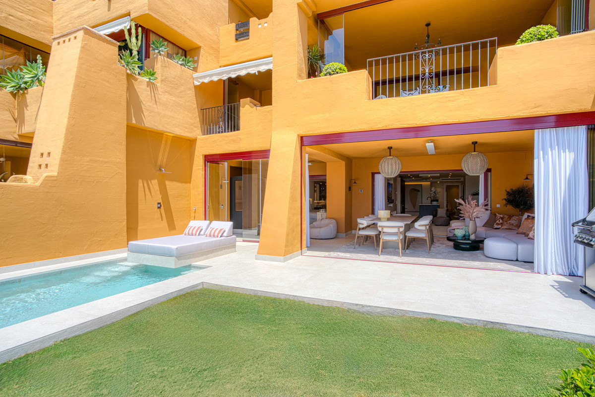 Impresionante apartamento orientado al sur con cuatro lujosos dormitorios y cuatro amplios baños, mezclando perfectamente la elegancia moderna con el confort de alta gama. Situado en la exclusiva urbanización Los Granados del Mar en la Nueva Milla de Oro, la residencia ofrece acceso directo a la playa y vistas panorámicas del Mar Mediterráneo. Completamente renovado con acabados premium, cuenta con una amplia terraza de 87 m2 con piscina privada y un exuberante jardín, perfecto para la relajación al aire libre. En su interior, encontrará una cocina abierta equipada con electrodomésticos alemanes de alto nivel, una placa invisible y una segunda cocina con nevera de vino, ideal para entretener. Entre los aspectos más destacados se incluyen suelos elegantes contemporáneos, calefacción por suelo radiante, una chimenea eléctrica, una bañera independiente, una sauna privada, una oficina dedicada, armarios personalizados y un sistema de sonido de última generación. Los residentes de esta exclusiva comunidad cerrada disfrutan de comodidades de clase mundial, incluyendo un restaurante in situ, piscina cubierta climatizada, dos piscinas al aire libre, gimnasio, sauna, jacuzzi, seguridad 24 horas, y cerca de restaurantes de alta gama, tiendas, escuelas internacionales, el nuevo complejo Laguna, y el corazón de Estepona.