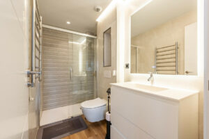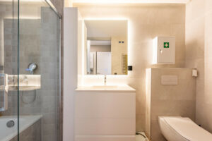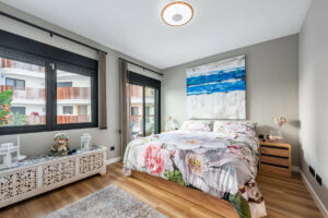 Baño con luz natural, el apartamento cuenta con dos terrazas orientadas al sur y al este, lo que le permite disfrutar del sol de mañana a tarde mientras contempla la tranquila zona de piscina, un verdadero oasis urbano que evoca un ambiente tipo resort en el centro de la ciudad. El diseño de planta abierta conecta perfectamente el amplio salón con la cocina moderna, creando un ambiente luminoso y sociable. Con cuatro dormitorios y tres baños, hay un amplio espacio para familias e invitados, todos diseñados en un estilo limpio y contemporáneo.