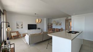 Este raro apartamento de cuatro dormitorios cuenta con 112 m² de superficie habitable más una generosa terraza de 43 m² con orientación sur, sureste y oeste, que garantiza sol y sombra durante todo el día. La parte oeste ofrece vistas a la zona de la piscina comunitaria, mientras que el resto disfruta de impresionantes vistas al mar. La cocina de concepto abierto se integra con el luminoso salón-comedor, con acceso directo a la terraza desde la cocina, el salón y dos dormitorios. Los otros dos dormitorios disfrutan de vistas a la montaña y abundante luz natural gracias a sus grandes ventanas.