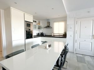 El apartamento cuenta con cuatro amplios dormitorios y un luminoso salón con cocina americana, creando un espacio acogedor y funcional. El dormitorio principal incluye acceso directo a un vestidor y a uno de los baños, lo que proporciona privacidad y comodidad. Un baño adicional se encuentra entre los otros dormitorios, garantizando la comodidad de los familiares y los invitados.