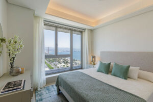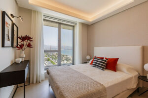 al puerto de Málaga. El alojamiento incluye una suite principal con vistas al mar, un segundo dormitorio con vistas al mar y baño en suite, y los dormitorios tres y cuatro con baño familiar compartido. Algunas de las características más importantes de la propiedad son el sistema de domótica ABB freehome, el sistema aerotérmico Daikin para el aire acondicionado, así como calefacción por suelo radiante y persianas Bandalux