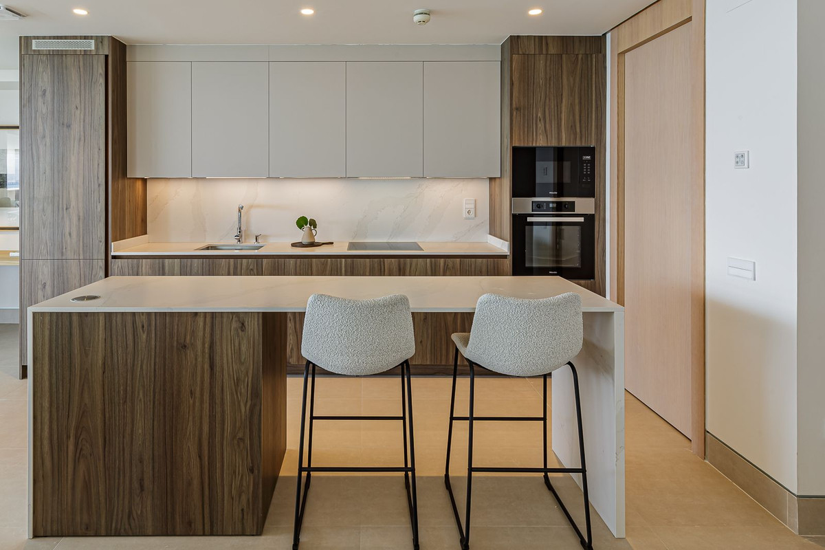 La propiedad se encuentra en la planta 15 y ofrece unas increíbles vistas panorámicas. El apartamento se vende totalmente amueblado, consta de un amplio vestíbulo de entrada, con baño de invitados, salón diáfano, cocina totalmente equipada de Gunni & Trentino con electrodomésticos Miele, enorme terraza cubierta de 44 metros orientada al sur con vistas al Mediterráneo y