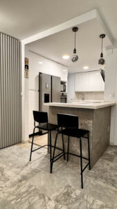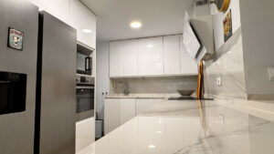 • Cocina integrada blanca y totalmente equipada, con encimeras de piedra, gran capacidad de almacenamiento y frigorífico side-by-side.