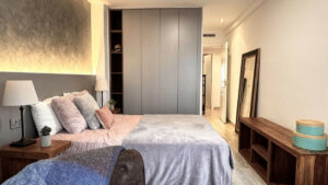 • 1 dormitorio principal amplio, con armarios renovados y decoración elegante.