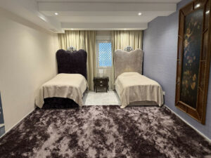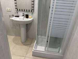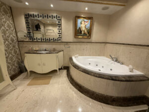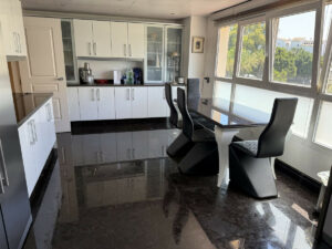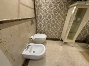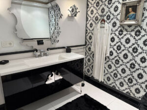 Acabados en mármol con mosaicos personalizados, suelo radiante, aire acondicionado, parquet en las zonas privadas y acceso adaptado en todo el edificio.