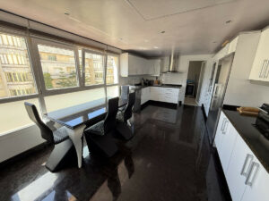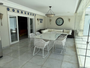 El apartamento tiene 487 m² (385 m² interiores + 103 m² de terraza), con tres dormitorios en suite con vestidor, habitación de servicio con baño, cocina equipada, lavadero, dos plazas de garaje y trastero.