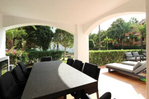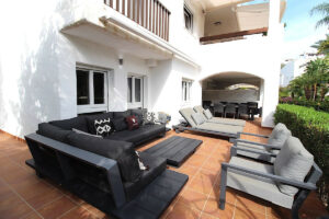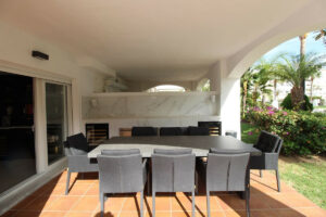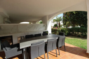 Nos complace ofrecer a la venta este impresionante apartamento esquinero con jardín, recién incorporado al mercado, en la exclusiva urbanización Las Adelfas, en primera línea de playa, en San Pedro Alcantara. La propiedad ha sido completamente reformada con materiales de la más alta calidad y cuenta con 4 dormitorios, 3 lujosos baños, un amplio salón-comedor con una moderna cocina americana con barra, suelos de mármol en toda la vivienda, aire acondicionado frío/calor, ventanas de doble acristalamiento con persianas de seguridad eléctricas, amplias terrazas que rodean el apartamento con una barra de mármol integrada, equipada con frigoríficos y vinotecas para disfrutar al máximo de sus reuniones. Las terrazas, muy privadas gracias a sus hermosos setos, dan acceso a los jardines y piscinas comunitarias, meticulosamente cuidados para su relajación y disfrute. La urbanización cuenta con seguridad las 24 horas y está situada en primera línea de las maravillosas playas y el mar Mediterráneo, donde encontrará numerosos restaurantes y bares de primera categoría para relajarse con familiares y amigos. El apartamento también incluye una plaza de aparcamiento subterráneo con trastero y acceso directo en ascensor. Si buscas el apartamento ideal en la mejor ubicación, te recomendamos encarecidamente que visites esta increíble vivienda, ya que no te decepcionará.