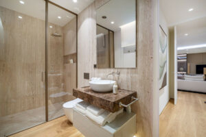 Baños de mármol travertino, paneles de madera personalizados y una cuidada combinación de materiales que incluye