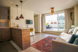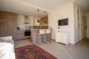 Al entrar en el apartamento a través de la nueva puerta de seguridad hecha a mano en madera de pino, se llega directamente al pasillo con mucho espacio de armario. A medida que entramos en la vivienda le da la bienvenida una impresionante isla de cocina que se integra armoniosamente con la sala de estar y la terraza, dando la impresión de que es parte de la sala de estar.