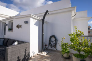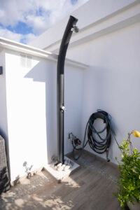 En la terraza también encontrará una ducha al aire libre y un lavadero cubierto con mucho espacio de almacenamiento.