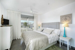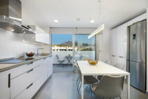 Impresionante ático de dos dormitorios, ambos con camas doble y baño en suite. El apartamento es moderno y contemporáneo, con materiales de alta calidad. La cocina, totalmente equipada, es de concepto abierto y está conectada al comedor y al salón.