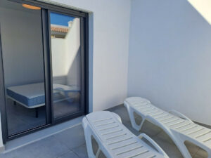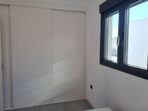 La propiedad cuenta con dos dormitorios dobles, ambos con armarios empotrados. El dormitorio principal tiene acceso directo a la terraza. El apartamento dispone de un baño familiar de diseño moderno con ducha tipo walk-in.