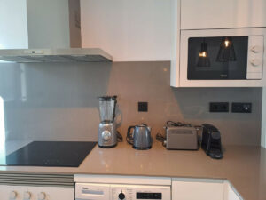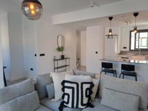Al entrar, un luminoso recibidor conduce a un salón de estilo nórdico con cocina moderna totalmente equipada y concepto abierto. La zona de estar y comedor se conecta directamente con una amplia terraza orientada al este de 28m², perfecta para disfrutar del sol de la mañana, relajarse o comer al aire libre.