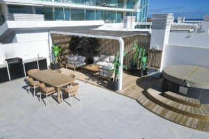 El punto culminante de este ático es, sin duda, su espectacular terraza privada en la azotea. Desde aquí, podrás deleitarte con vistas panorámicas a la costa, disfrutar de cenas al aire libre o simplemente relajarte bajo el sol mientras contemplas el impresionante paisaje.
