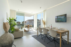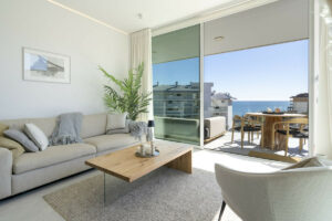 Al entrar, te recibe un interior sofisticado donde la estética moderna se fusiona con la calidez y la funcionalidad. La amplia zona de estar se inunda de luz natural gracias a los ventanales de suelo a techo, que enmarcan unas vistas espectaculares del Mediterráneo. Los elegantes acabados y el exquisito diseño crean un ambiente acogedor, ideal tanto para el descanso como para el entretenimiento.