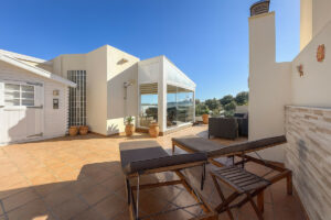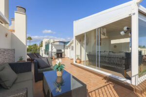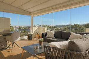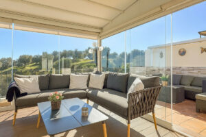 Los actuales propietarios han transformado una parte de la azotea en una pérgola de cristal cerrada que se puede abrir con puertas correderas, creando una segunda sala de estar o lounge muy acogedora con vistas espectaculares durante todo el año.