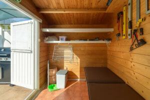 Además, la terraza superior incluye una pequeña cabaña que actualmente funciona como taller y trastero, pero que cuenta con una pequeña cocina, brindando el potencial de ser convertida en un estudio o habitación de invitados independiente.