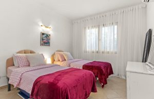 El dormitorio doble de invitados, con acceso desde un largo pasillo privado, ofrece dos camas individuales, elegantes cortinas blancas de red y armarios dobles correderos integrados con paneles de madera. El espacioso baño de invitados adyacente, completamente renovado, también cuenta con azulejos contemporáneos, mueble de lavabo con encimera de mármol y focos de techo integrados.