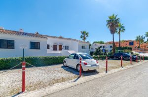 A la entrada del bloque de apartamentos se encuentra una zona de aparcamiento designada con varias plazas asignadas.