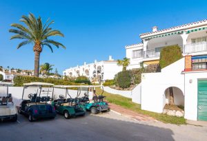Aparcamiento designado para carritos de golf disponible dentro del aparcamiento comunitario principal con seguridad y acceso electrónico.