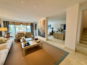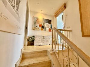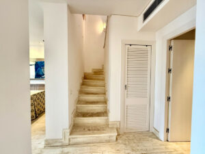 Distribuido en dos niveles, la planta baja cuenta con un dormitorio con baño en suite, una cocina completamente equipada y un amplio salón-comedor. En la planta superior se encuentra el dormitorio principal con baño en suite y acceso directo a la gran terraza privada, perfecta para relajarse mientras disfruta de vistas panorámicas al mar.