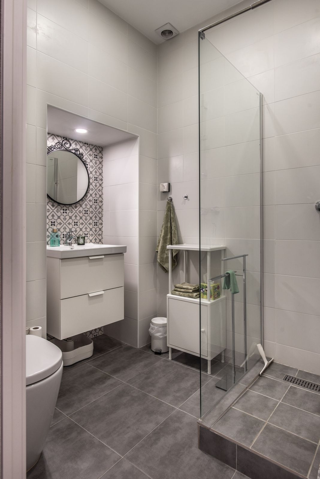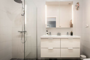 Un dormitorio principal con armarios empotrados y baño en suite con ducha amplia.
