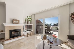 Ubicado en la primera planta, el apartamento ofrece un salón amplio y luminoso con chimenea y acceso a la terraza, que goza de orientación suroeste y vistas al mar.