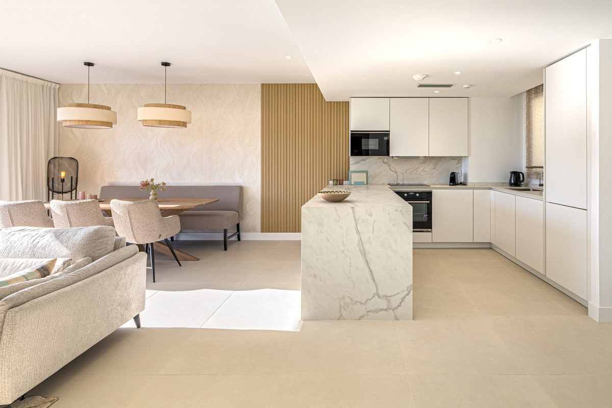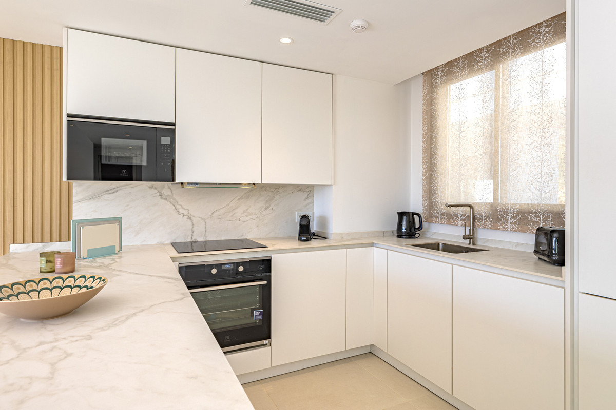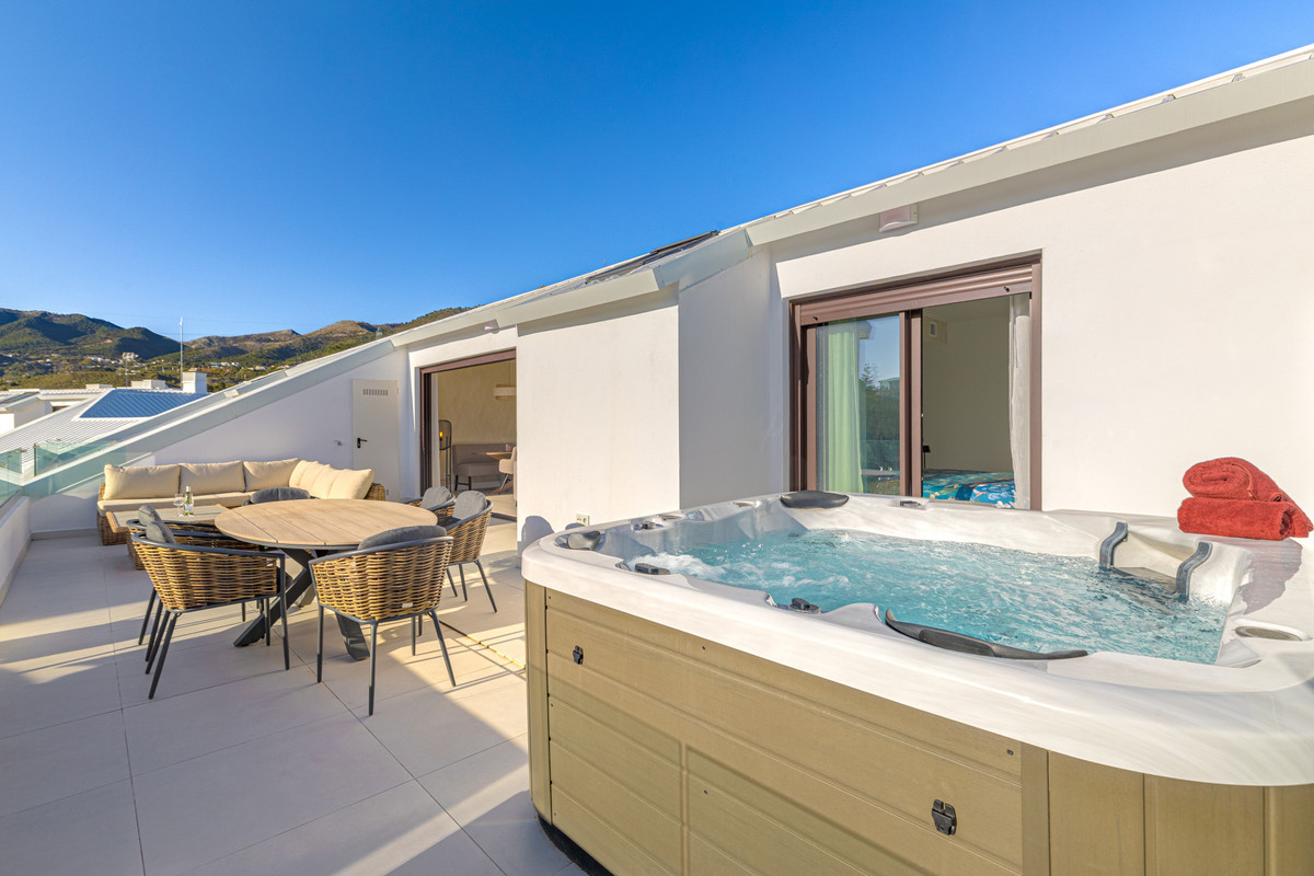 Esta elegante propiedad ofrece 2 amplios dormitorios y 2 modernos cuartos de baño de precioso diseño, creados pensando en el confort y en una vida contemporánea refinada. La luminosa zona de estar diáfana está inundada de luz natural y se integra a la perfección con una impresionante terraza privada de 50 m², sin duda una de las características más destacadas de la vivienda. Aquí encontrará un lujoso jacuzzi, que crea el escenario perfecto para relajarse mientras disfruta de impresionantes puestas de sol y vistas parciales al mar gracias a su privilegiada orientación suroeste.