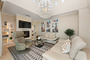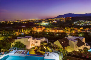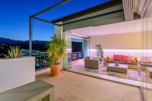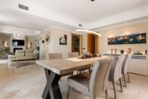 La zona de estar irradia elegancia y tranquilidad, con un comedor independiente bañado en luz natural que se abre a una amplia terraza. La sala de estar, igualmente impresionante, cuenta con techos altos, iluminación contemporánea, una acogedora chimenea y un ambiente cálido y relajado. Grandes puertas correderas crean una conexión fluida entre el interior y el exterior, enmarcando vistas espectaculares al mar Mediterráneo y al campo de golf de Los Flamingos.